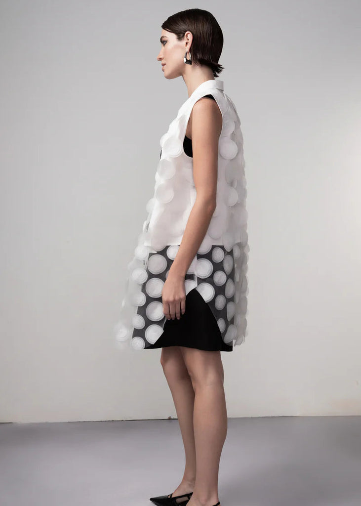• Sheer fabric with circular appliqué detailing